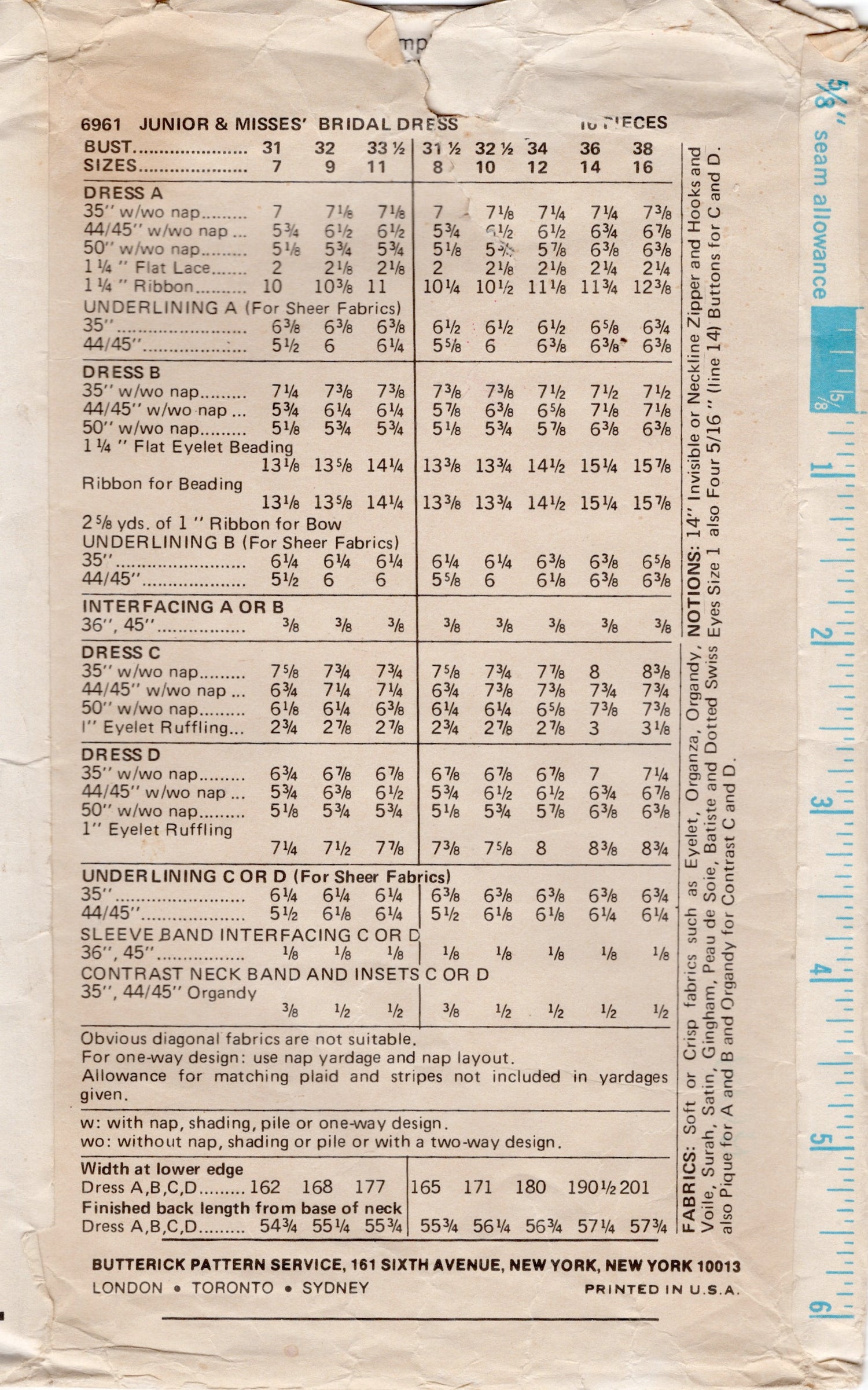 1970's Butterick Empire Waist Tiered Wedding Dress Pattern with Square Neckline - Bust 38"- No. 6961 is backordered and will ship as soon as it is back in stock.