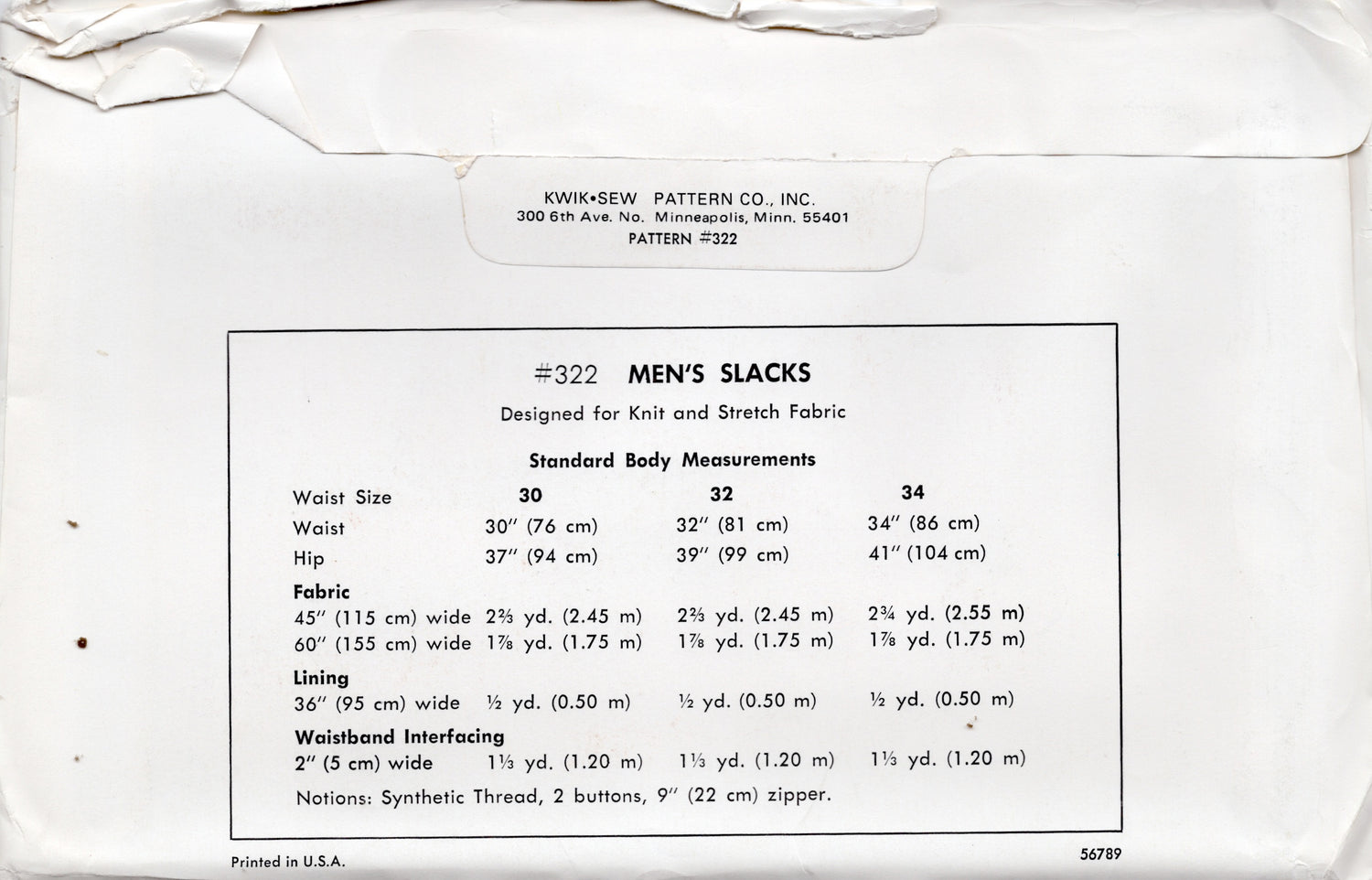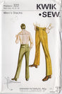 1970's Kwik Sew Men's Straight Leg Pants pattern - Waist 30-34" - No. 322