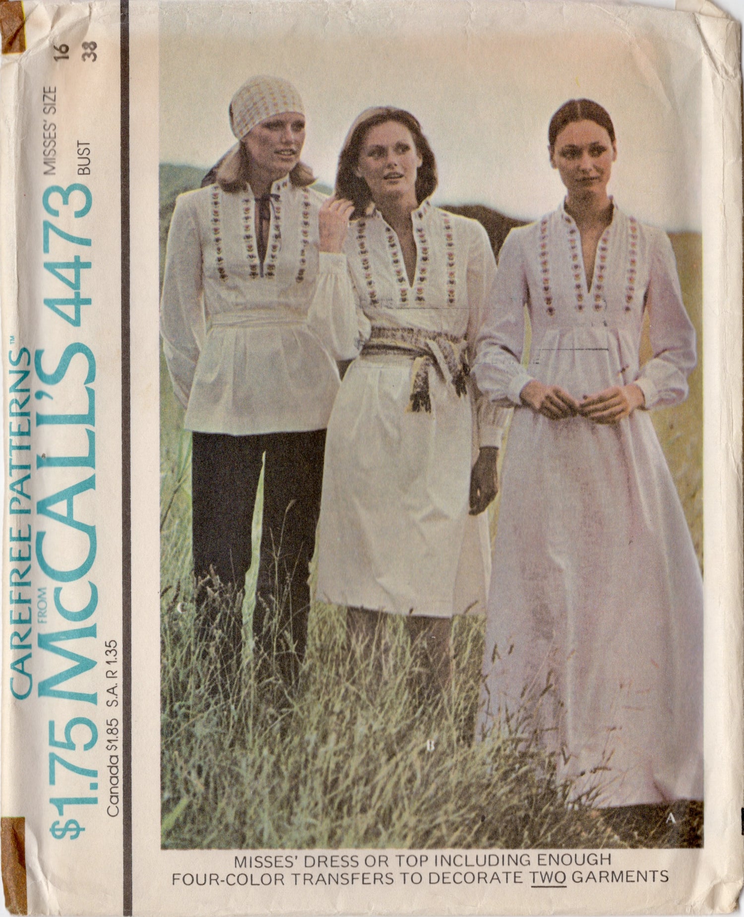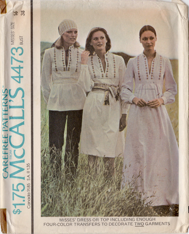 1970's McCall's Deep V Top, Mini or Maxi Dress Pattern with Four Color Transfer - Bust 38" - No. 4473 is backordered and will ship as soon as it is back in stock.
