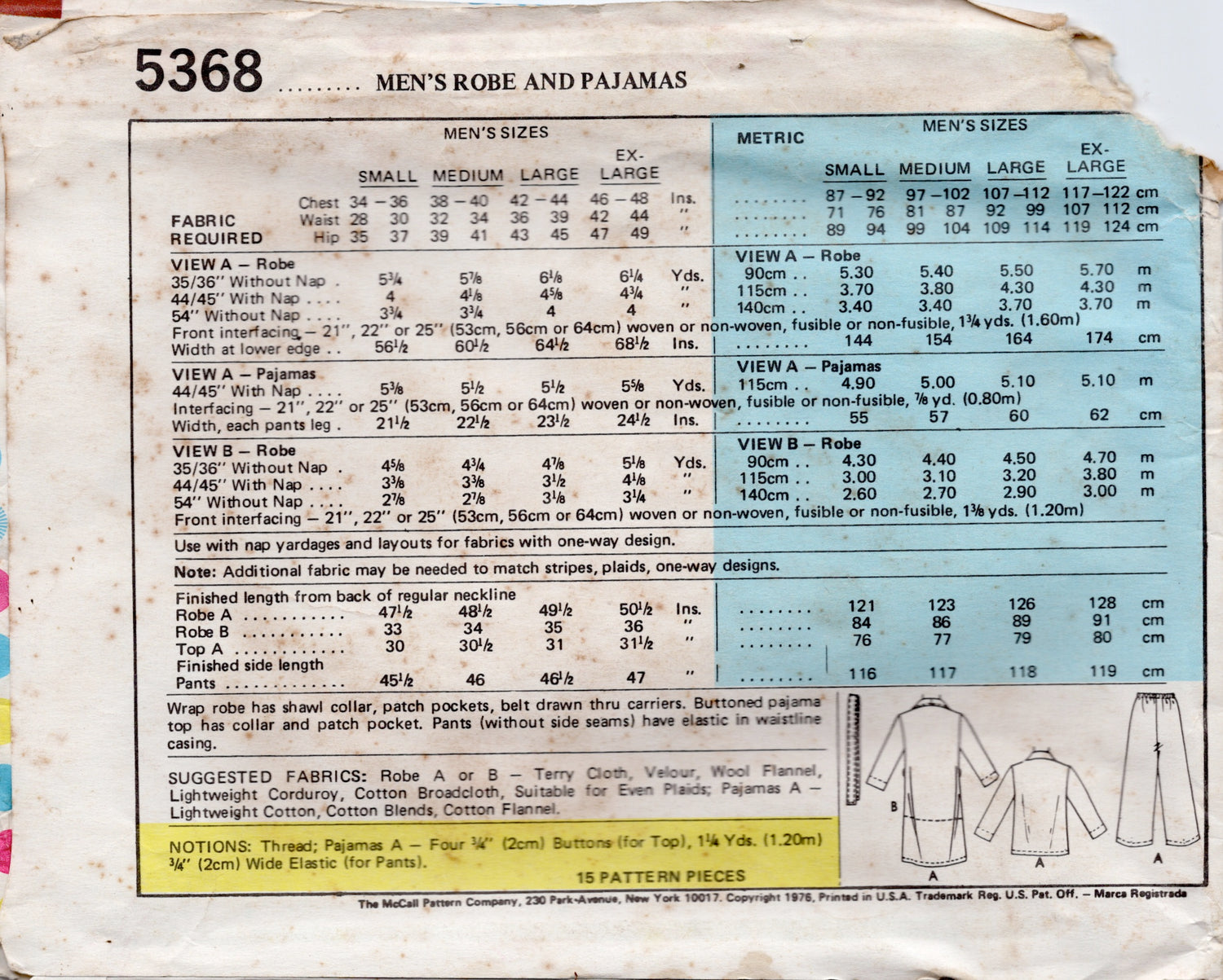 1970's McCall's Men's Robe and Pajama Pattern - Chest 42-44" - No. 5368 is backordered and will ship as soon as it is back in stock.