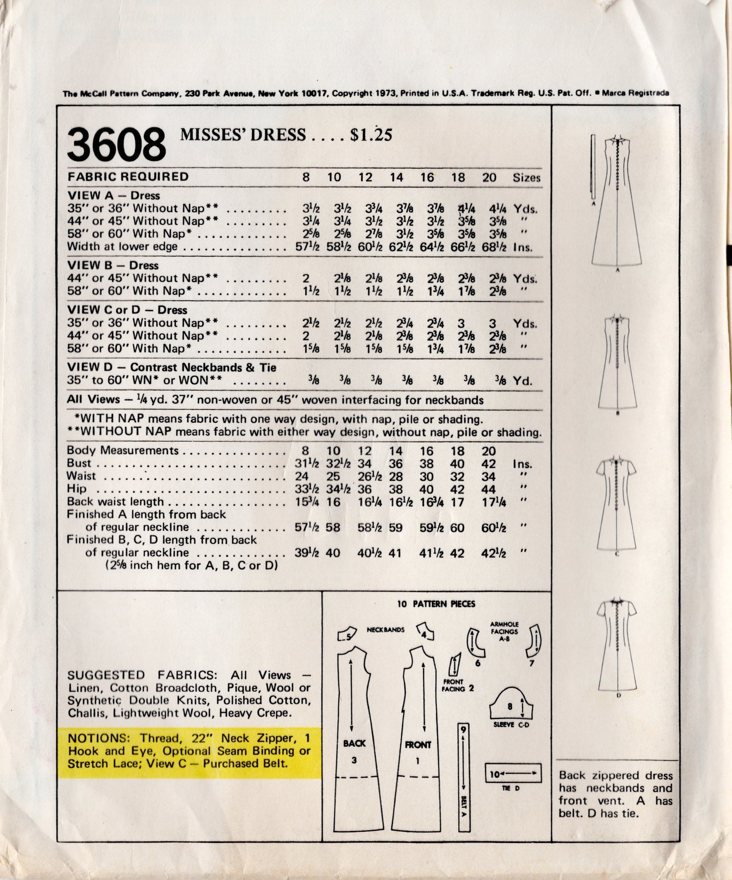 Back zippered dress has neckbands and front vent. A has belt. D has tie.