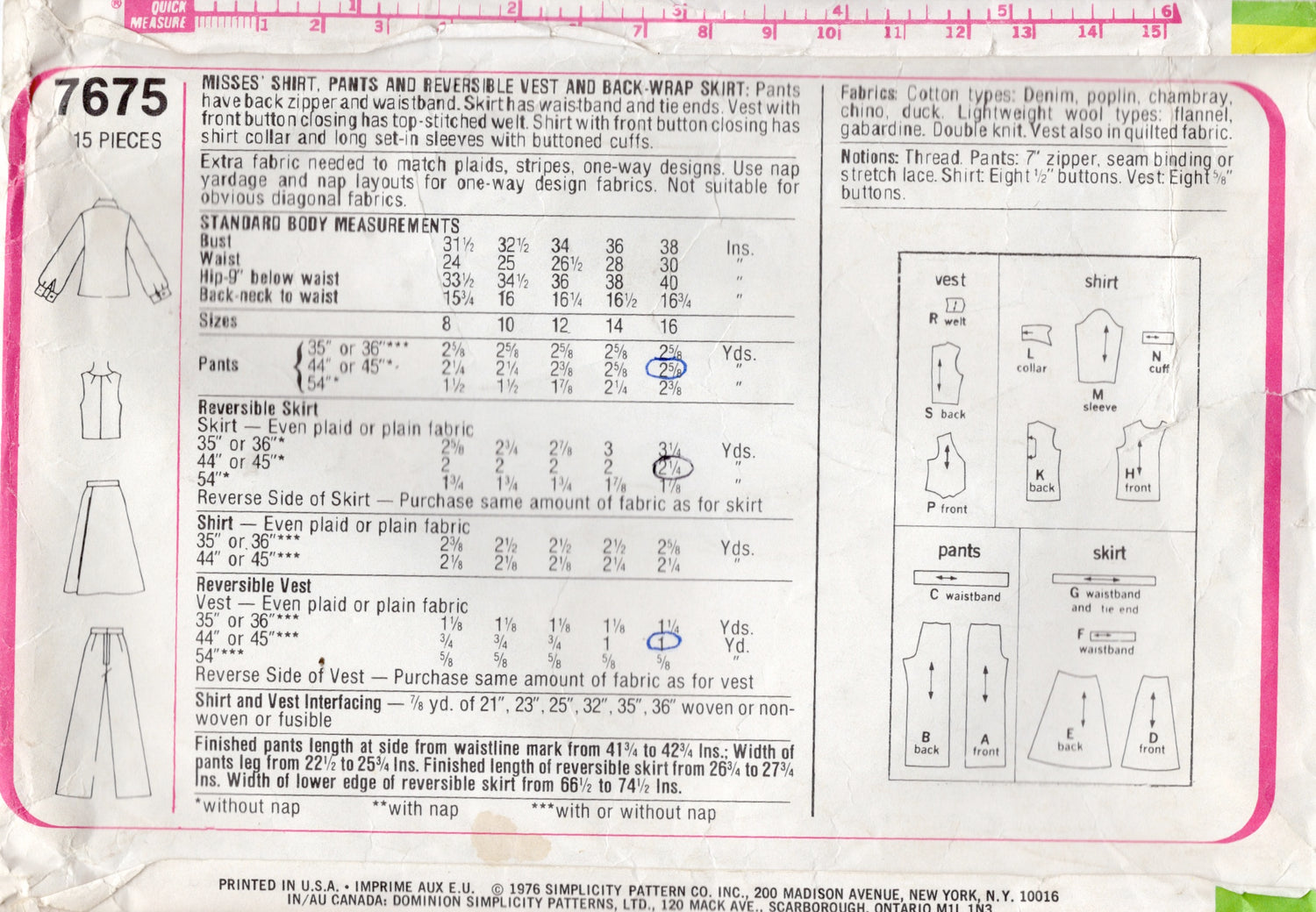 1970's Simplicity Button Up Shirt, Pants, Reversible Vest and Back Wrap Skirt Pattern - Bust 38" - No. 7675 is backordered and will ship as soon as it is back in stock.