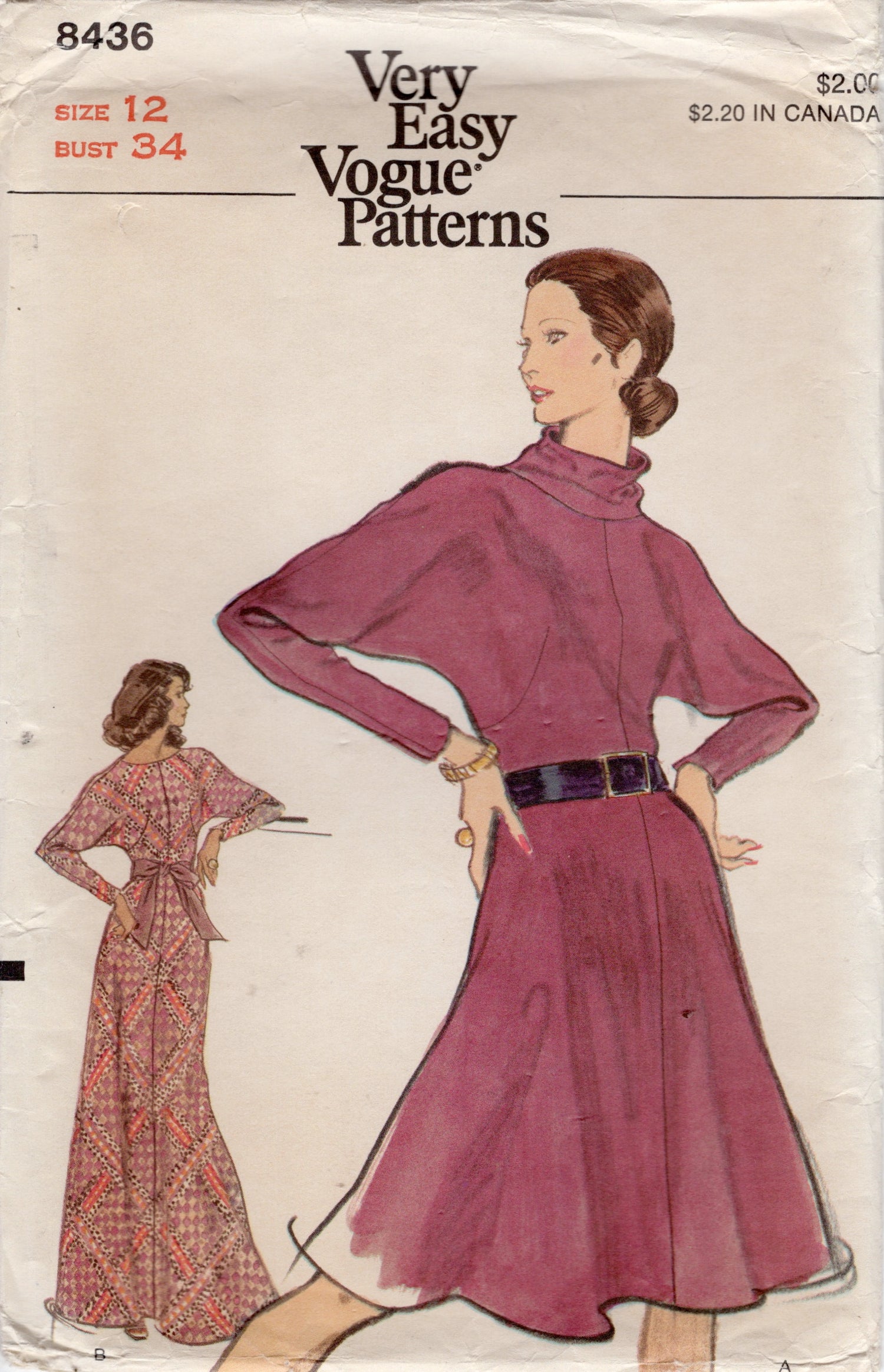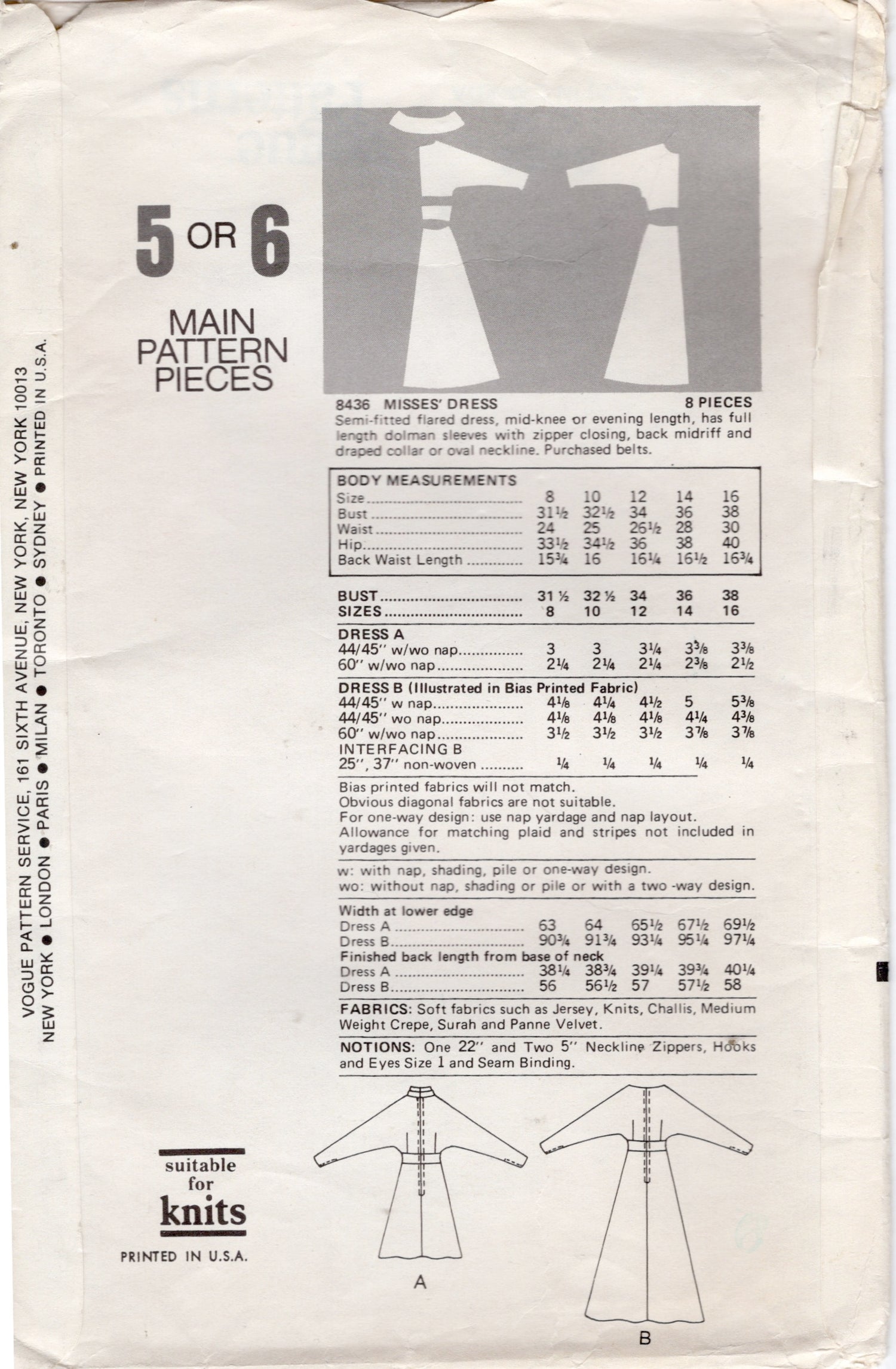 1970's Vogue One Piece Dress Pattern with High neckline, Dolman self sleeve in two lengths - Bust 34" - No. 8436 is backordered and will ship as soon as it is back in stock.