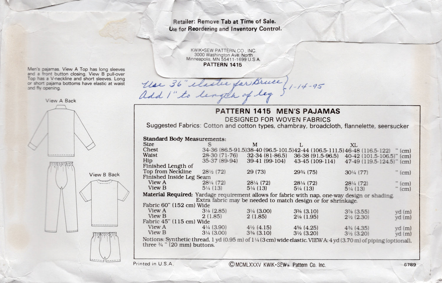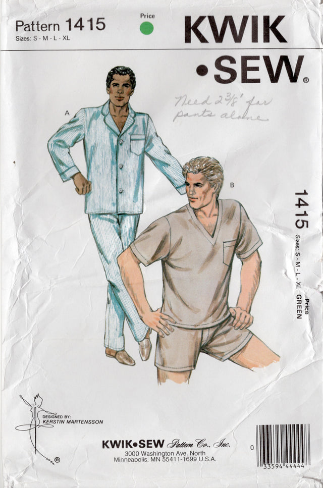 1980's Kwik Sew Men's Two Piece Pajamas pattern - Chest 34-48" - No. 1415