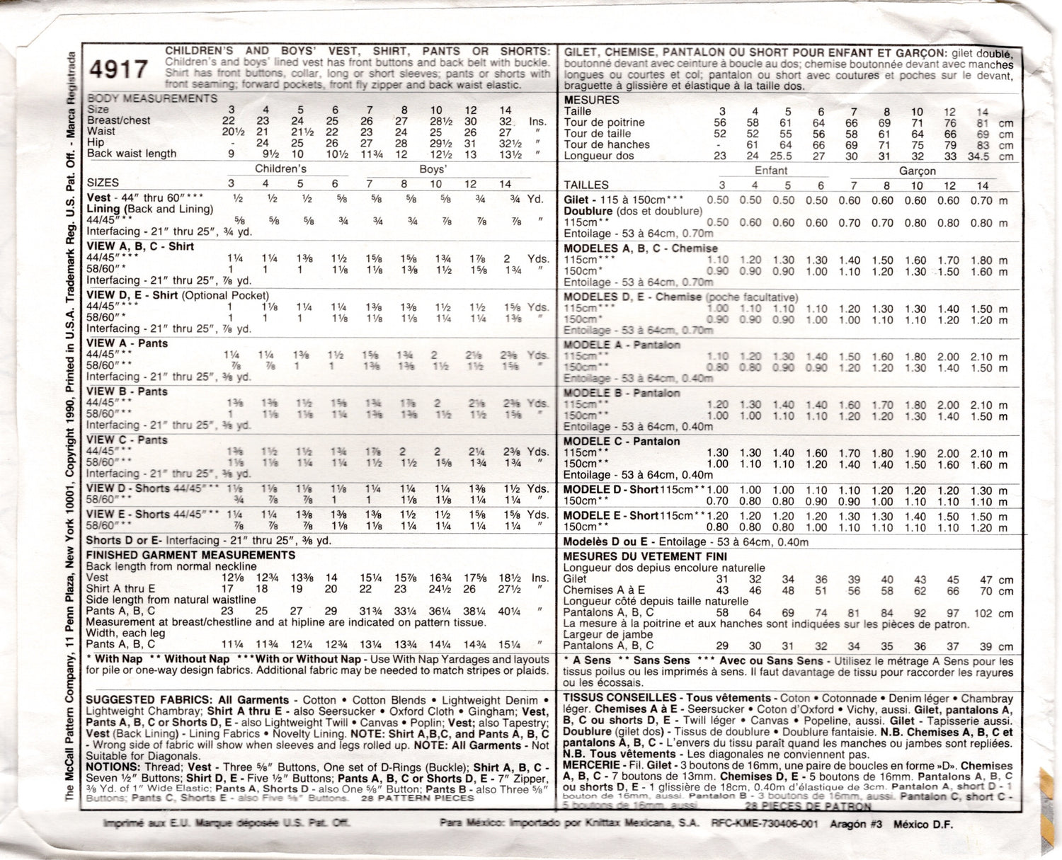 1990's McCall's Child's Vest, Shirt and Pants or Shorts Pattern - Chest 32" - No. 4917