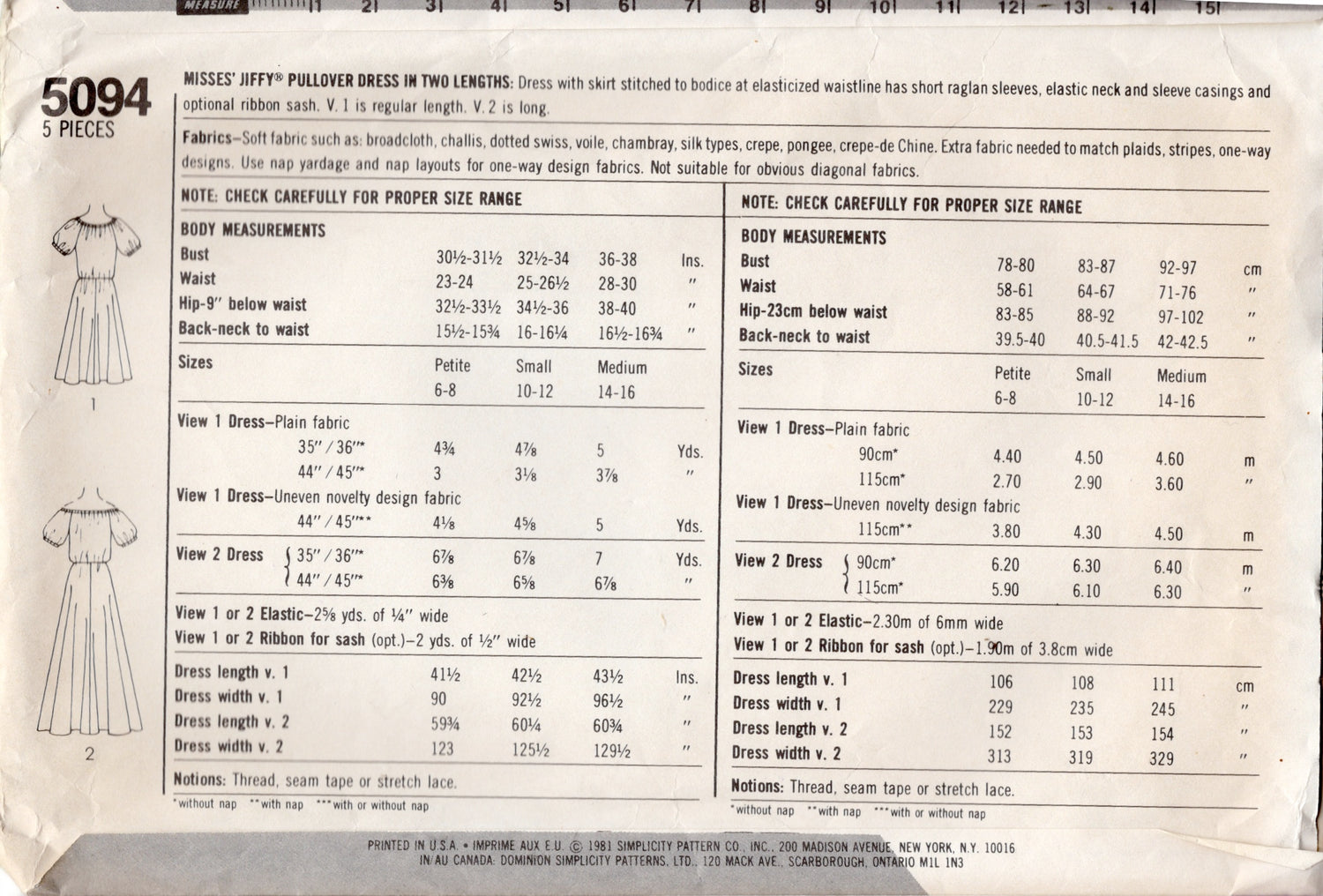 Pullover Dress in Two Lengths: Dress with skirt stitched to bodice at elasticized waistline has short raglan sleeves, elastic neck and sleeve casings and optional ribbon sash. V. 1 is regular length. V. 2 is long.