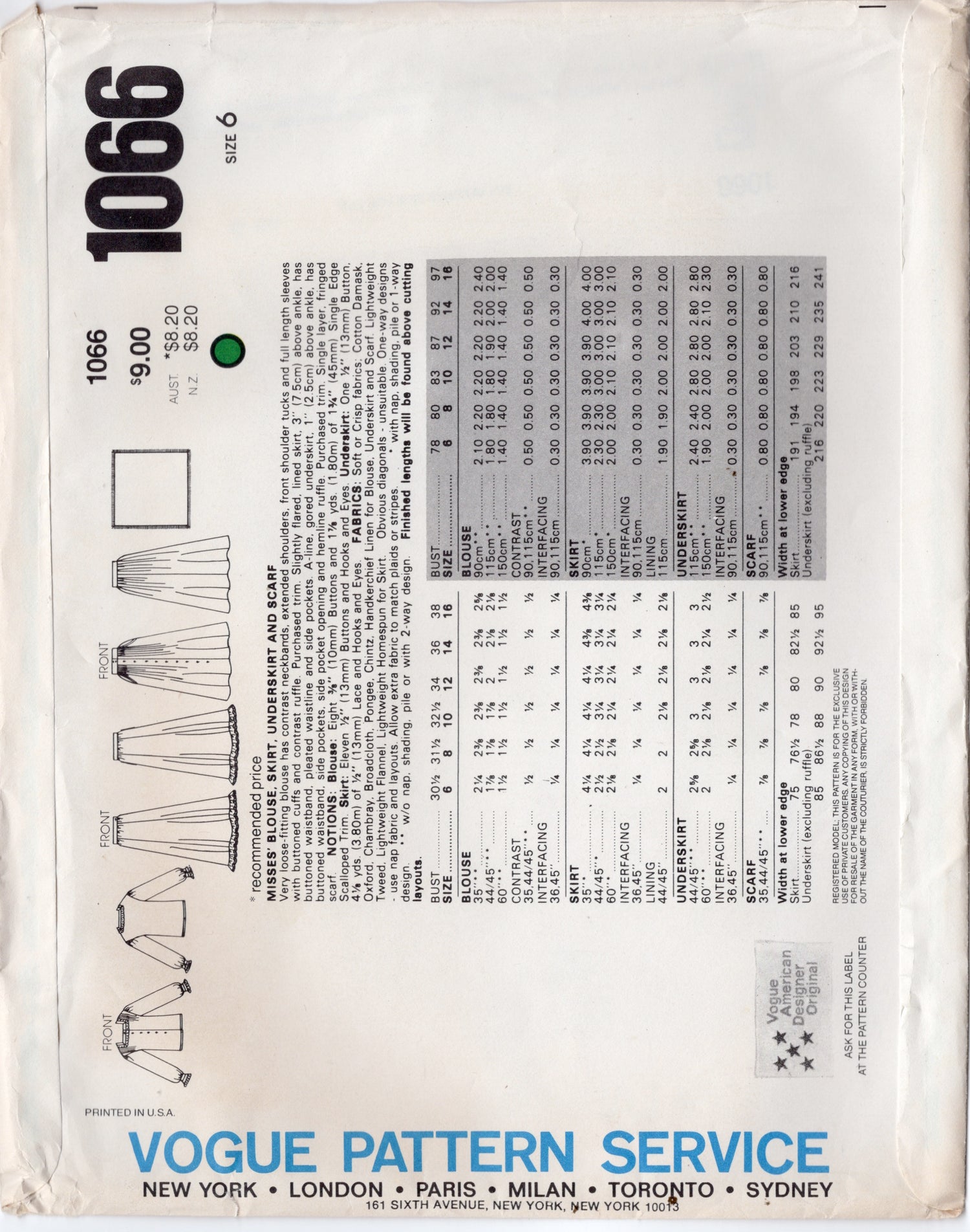 1980's Vogue American Designer Button-Up Blouse, Skirt, Underskirt and Scarf Pattern - Bust 30.5" - No. 1066 is backordered and will ship as soon as it is back in stock.