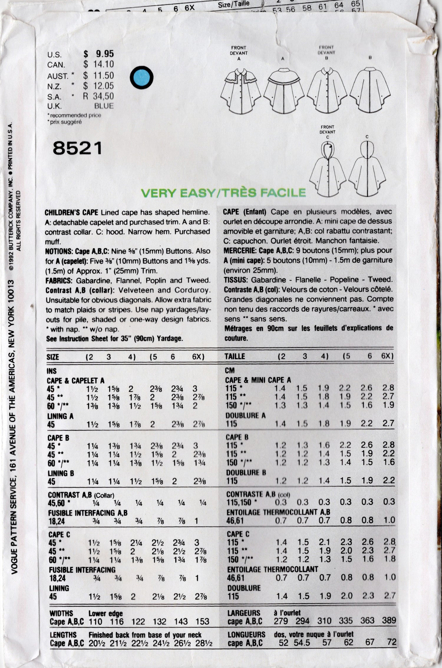 1990's Little Vogue Child's Cape with or without Hood pattern - Chest 21-23" - No. 8521 is backordered and will ship as soon as it is back in stock.