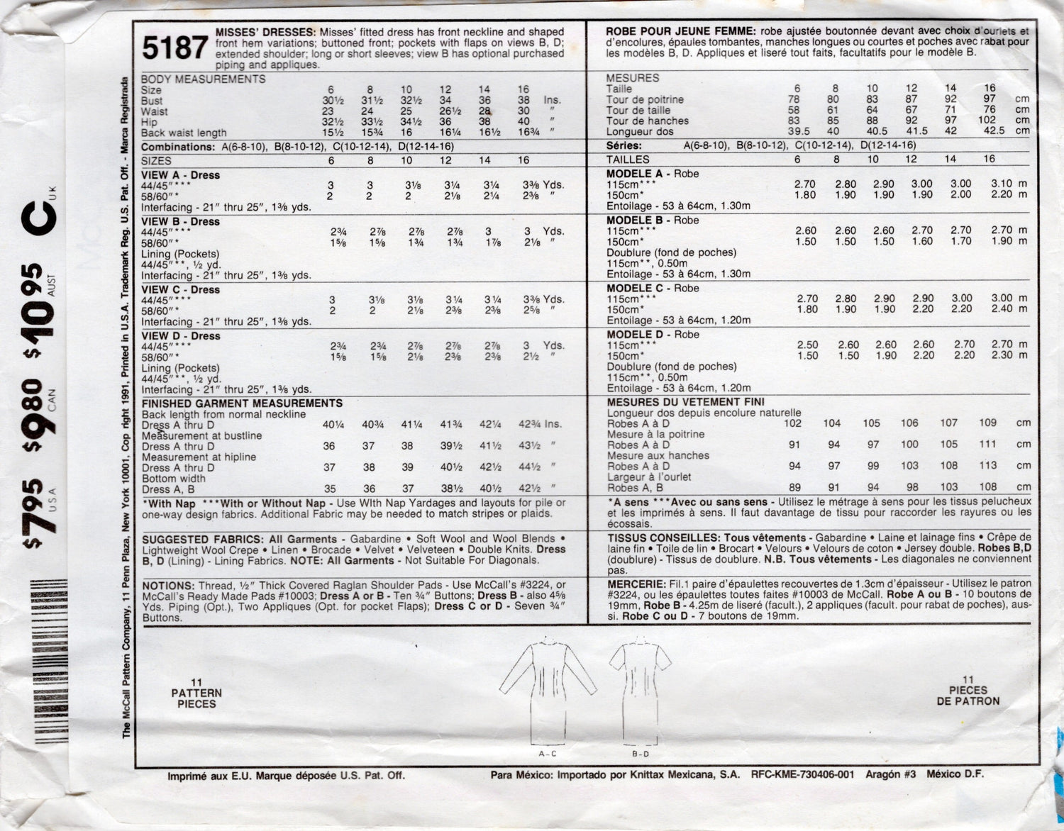 1990's McCall's Button Front Sheath Dress - Bust 30.5-32.5" - No. 5187 is backordered and will ship as soon as it is back in stock.