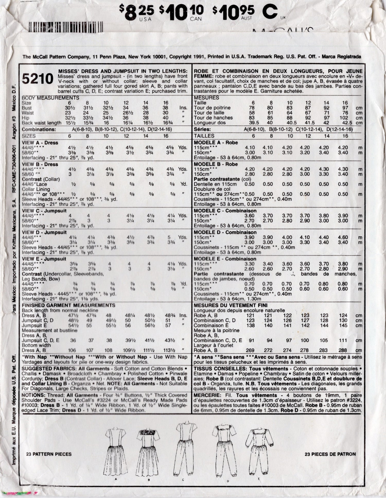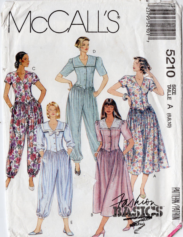 1990's McCall's Jumpsuit or Dress with Large Collar and Short or 3/4 Sleeves - Bust 30.5-32.5" - No. 5210 is backordered and will ship as soon as it is back in stock.