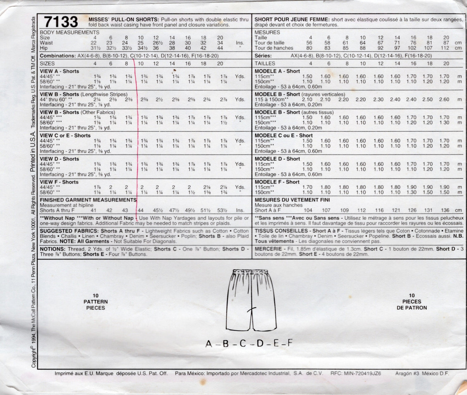 1990's McCall's Pull-on Wrap Shorts Pattern - Waist 22-24" - No. 7133 is backordered and will ship as soon as it is back in stock.