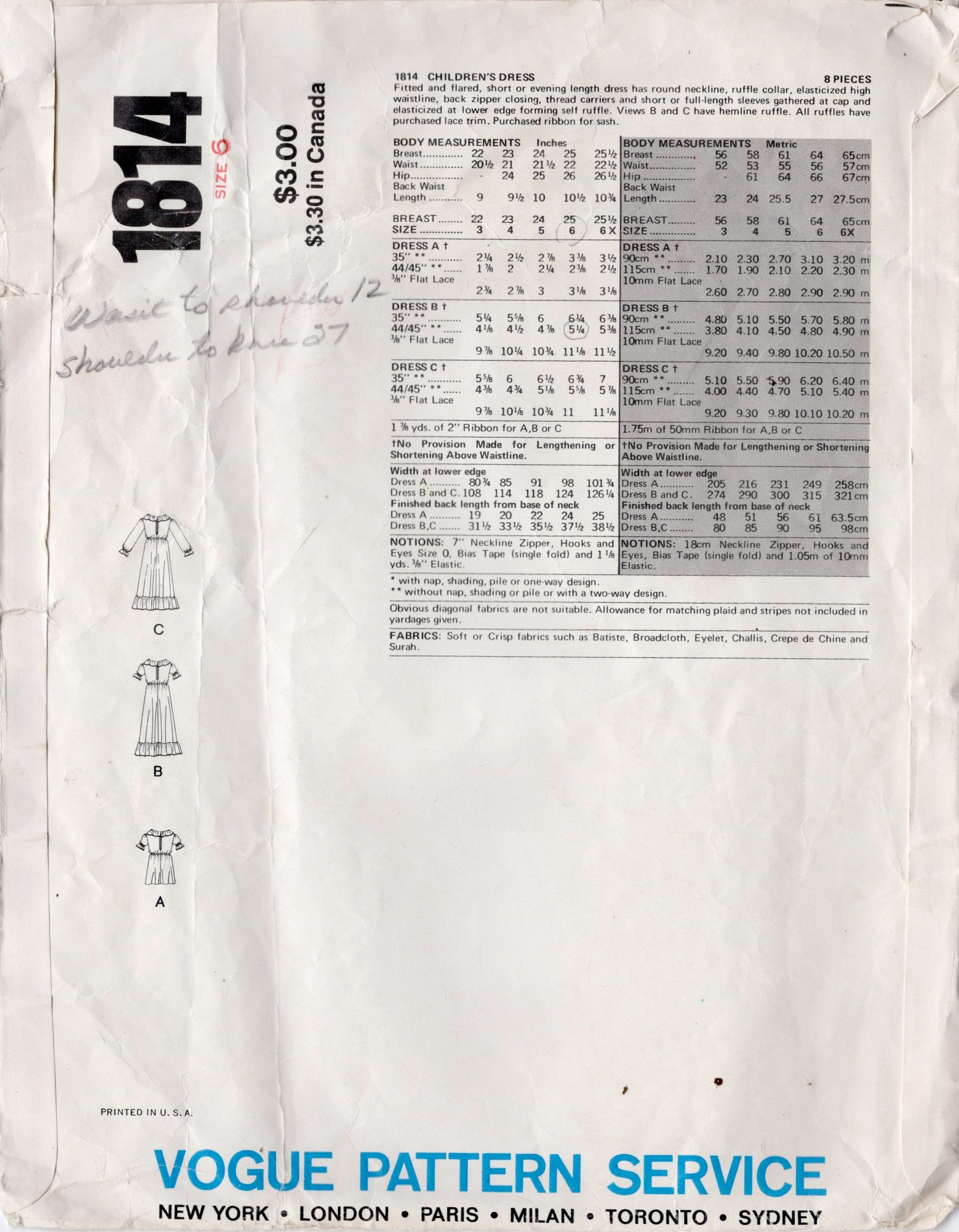1970's Very Easy Little Vogue Child's Dress pattern - Chest 25" - No. 1814 is backordered and will ship as soon as it is back in stock.