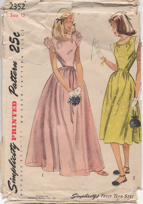 1950's Simplicity Junior's Daytime and Evening Dress pattern - Bust 30 - No. 2352