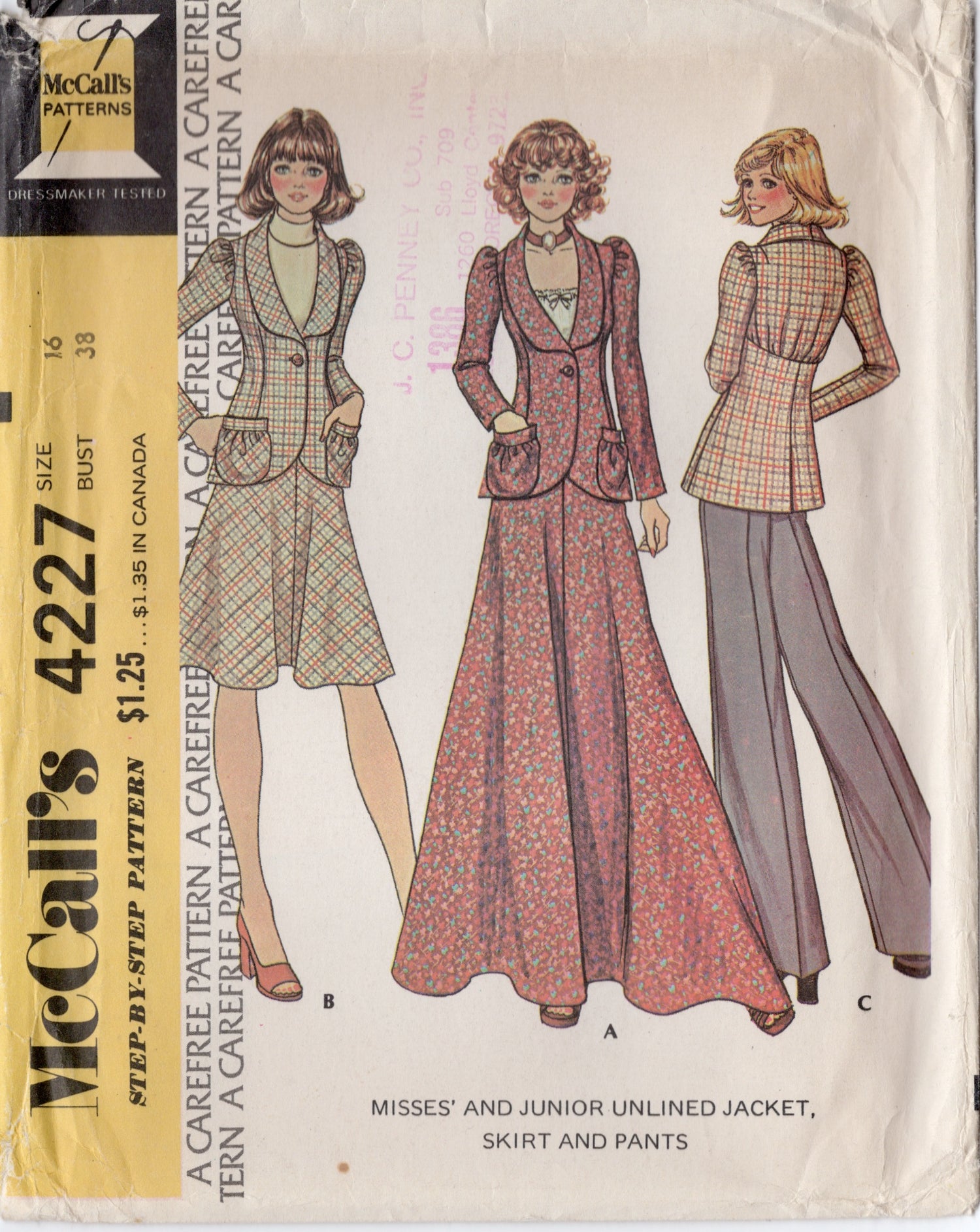 1970's McCall's Unlined Jacket with Patch pockets, Midi or Maxi Skirt and Pants Pattern - Bust 38" - No. 4227 is backordered and will ship as soon as it is back in stock.