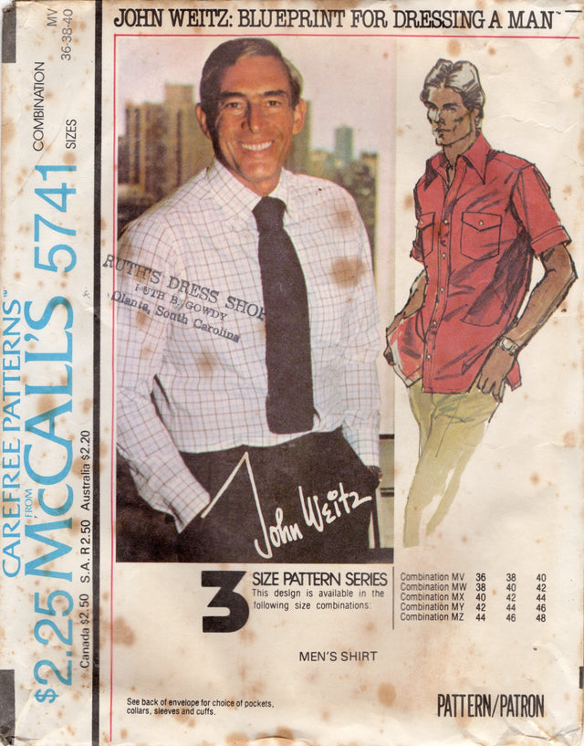 1970's McCall's John Weitz Button Up Shirt Pattern - Chest 36-48" - No. 5741 - Chest 36-38-40" is backordered and will ship as soon as it is back in stock.