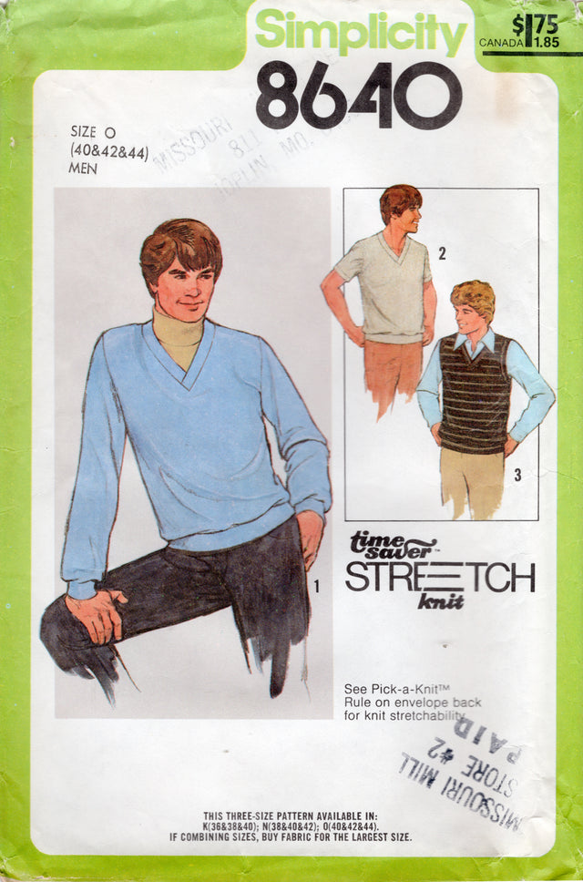1970's Simplicity Men's Pullover Cardigan or Sweater Vest Pattern - Chest 40-44" - No. 8640 is backordered and will ship as soon as it is back in stock.