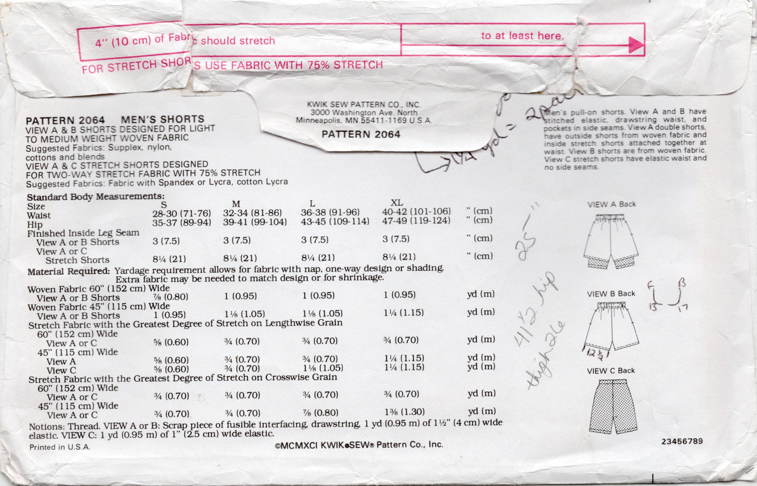 1990's Kwik Sew Men's Shorts - Waist 28-42" - No. 2064 is backordered and will ship as soon as it is back in stock.