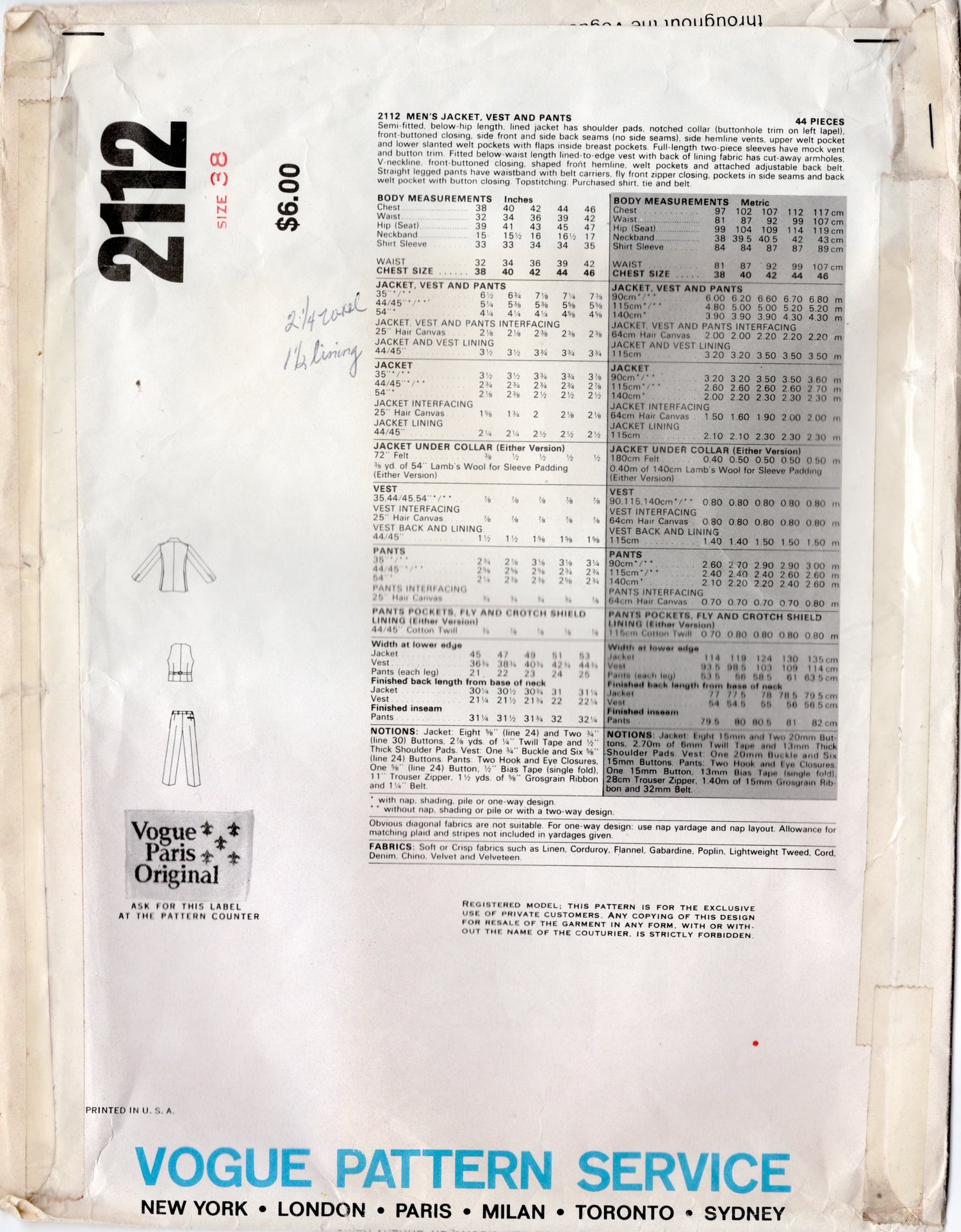 1970's Vogue Paris Original Men's Three Piece Suit Pattern by Givenchy - Chest 38" - No. 2112 is backordered and will ship as soon as it is back in stock.