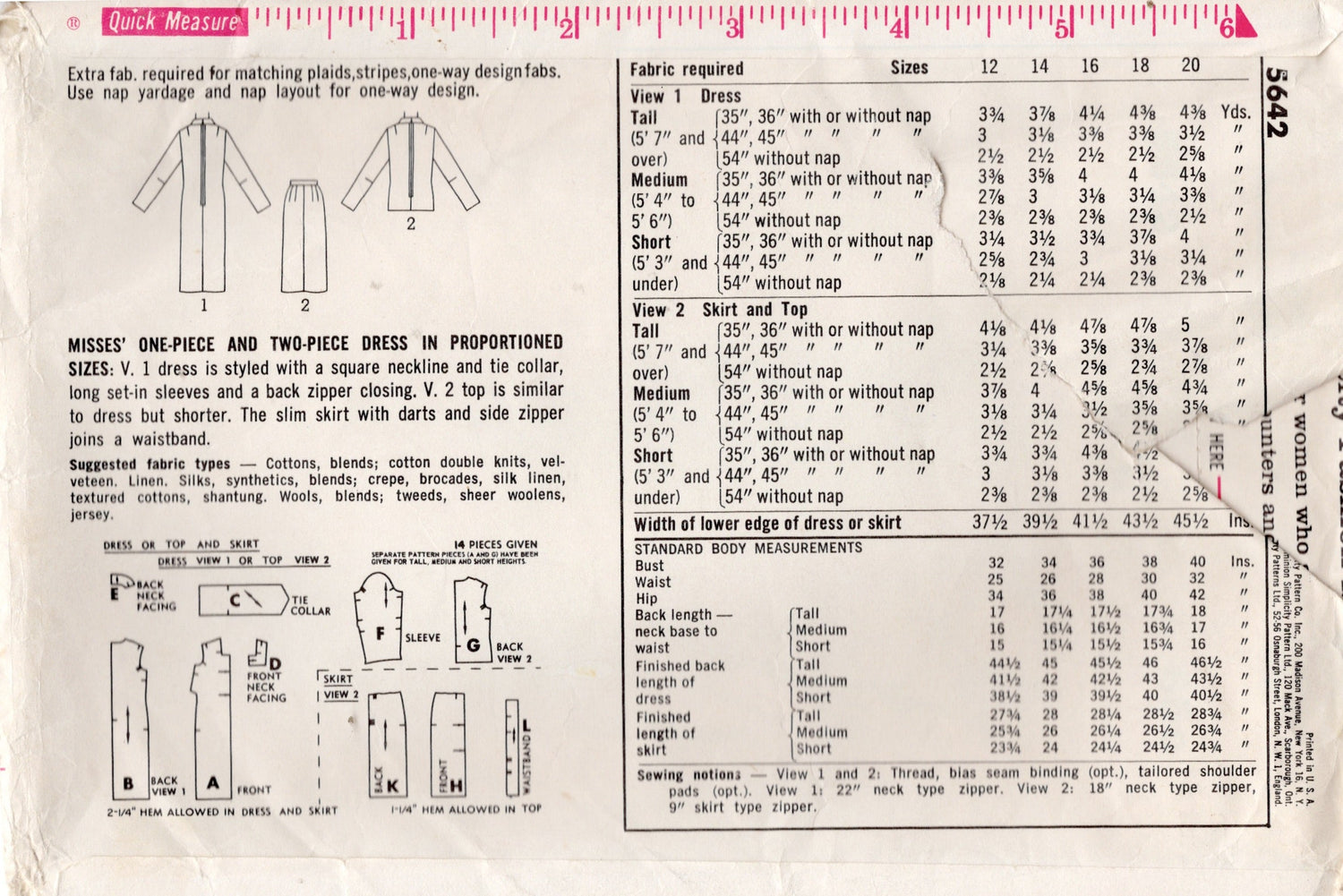 1960's Simplicity One Piece or Two Piece Dress Pattern with Tie Collar - Bust 34" - No. 5642