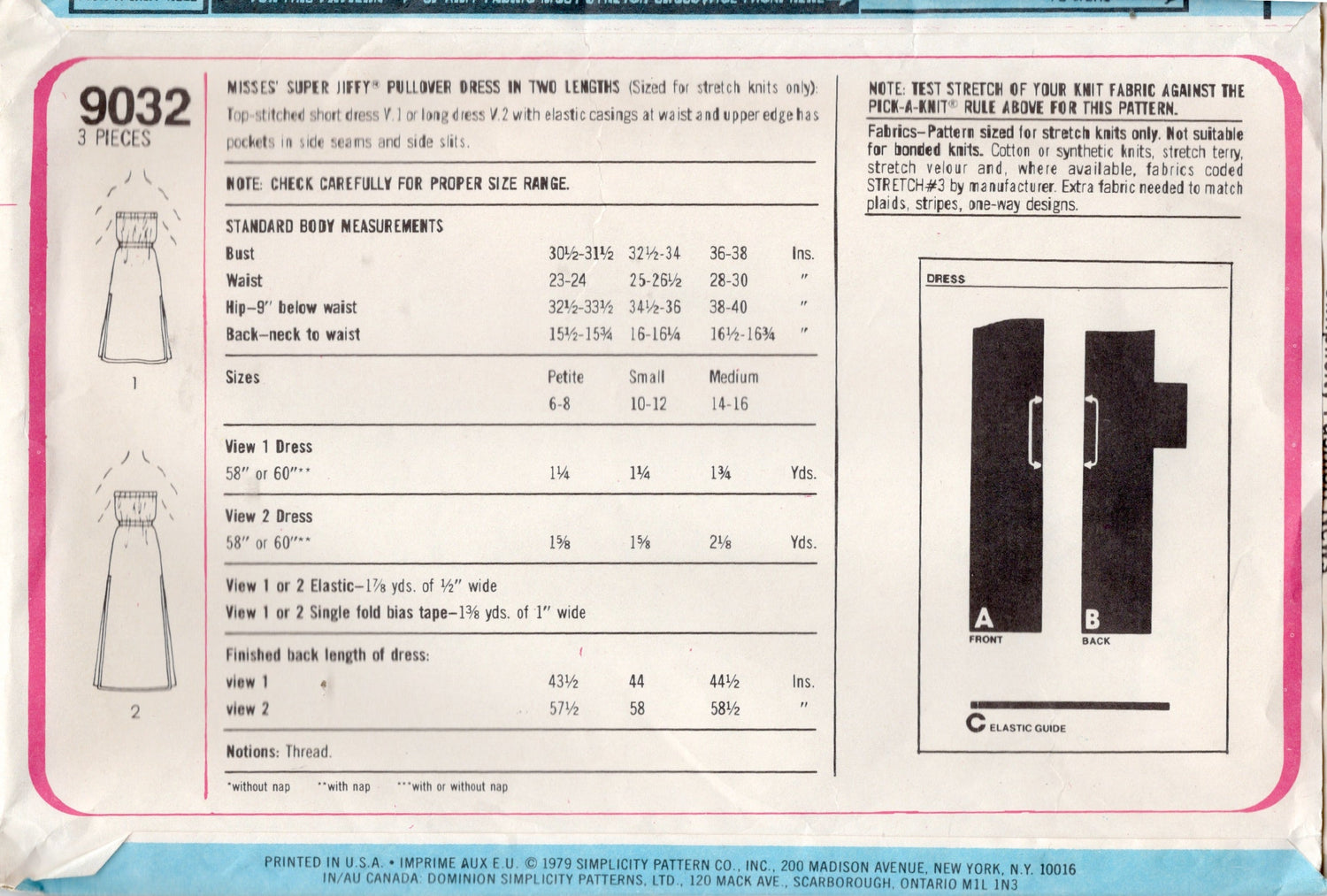 Super Jiffy Pullover Dress in two lengths (Sized for stretch knits only): Top-stitched short dress V.1 or long dress V.2 with elastic casings at waist and upper edge has pockets in side seams and side slits.