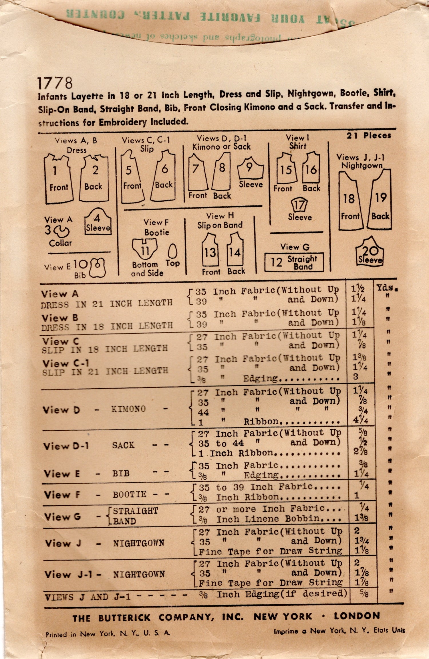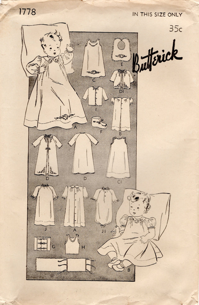 1940's Butterick Infant Layette Pattern - 18" or 21" lengths - No. 1778 is backordered and will ship as soon as it is back in stock.