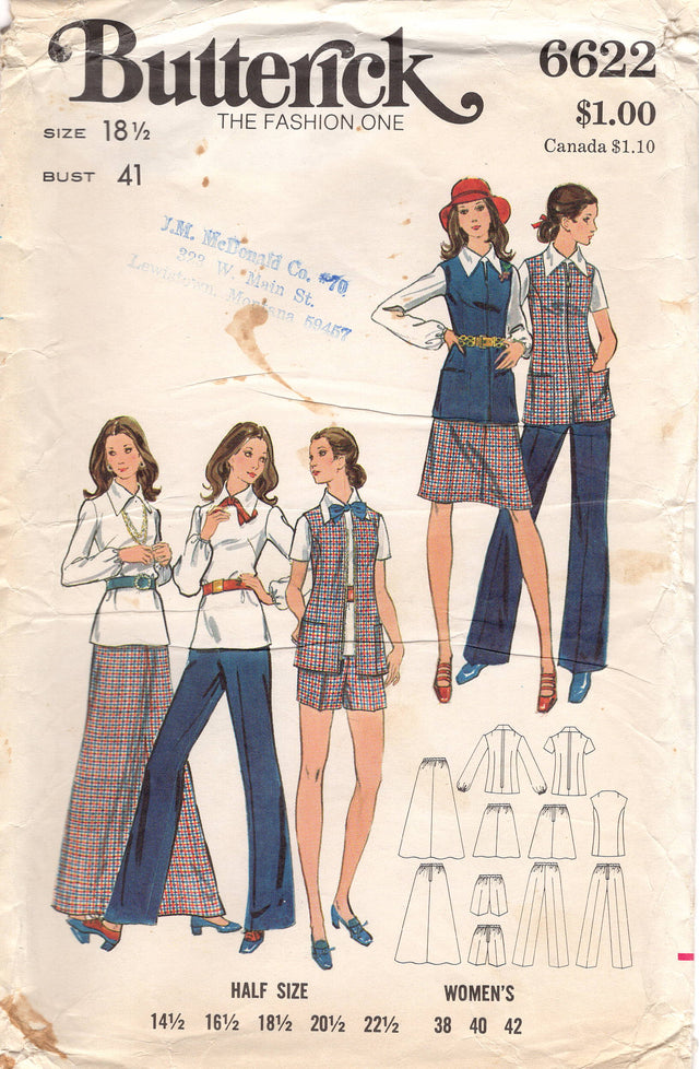 1970's Butterick Jacket, Skirt in Two Lengths, High-waisted Pants or Shorts and Blouse Pattern- Bust 41" - No. 6622 is backordered and will ship as soon as it is back in stock.