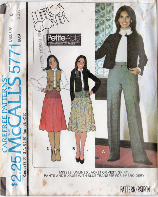 1970's McCall's Marlo's Corner Unlined Jacket or Vest, Tucked Skirt, Pants and Blouse pattern includes Embroidery - Bust 30.5-38" - No. 5771 - Bust 30.5" (sz 6) is backordered and will ship as soon as it is back in stock.