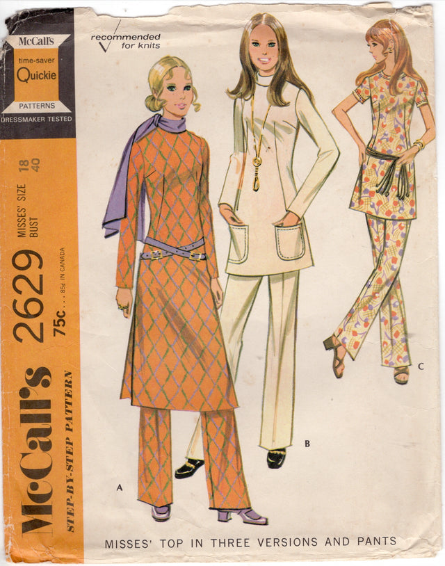 1970's McCall's Tunic or Top Pattern in 3 lengths and High Waisted Pants Pattern - Bust 40" - No. 2629 is backordered and will ship as soon as it is back in stock.