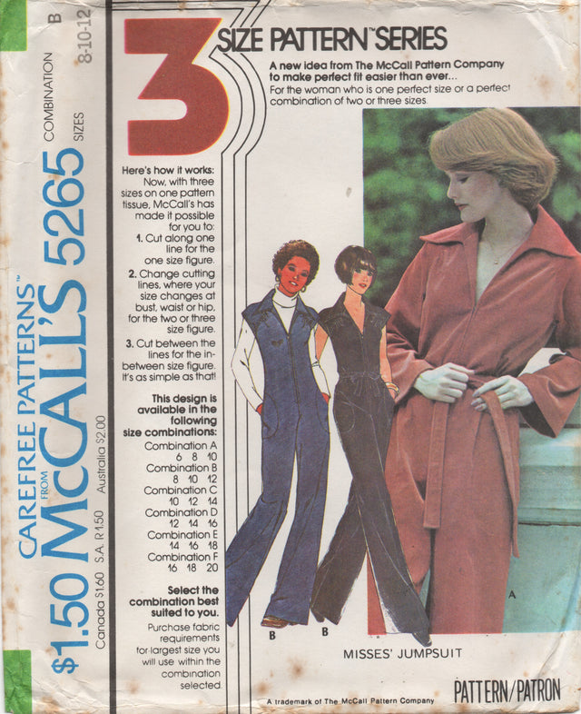 1970's McCall's Zip Front Jumpsuit with or without Sleeves - Bust 31.5-38" - No. 5265 - Bust 30.5-32.5" (sz 6-10) is backordered and will ship as soon as it is back in stock.