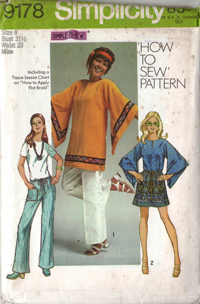 Simple-To-Sew Misses' Tunic and Hip-Hugger Pants: (Including a Tissue Lesson Chart ... "How-to Apply Flat Braid"). The tunic with slits in side seams and three quarter length kimono sleeves has front slit opening in lowered round neckline fastened with loop and button. V. 1 has optional embroidered braid trim. V. 2 has a purchased belt. The hiphugger pants with cord drawstring slipped thru casing at upper edge have rick-rack trimmed patch pocket and are made to be worn 2" below normal waistline.